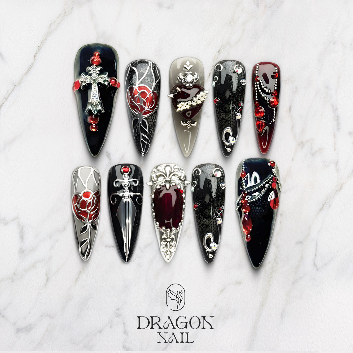 Gothic Rose Cross Nails, Ivory Black Luxury Press-On Nail Set With Sword & Floral Art, Limited Edition