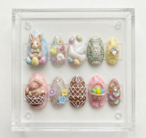 This handmade press-on nail set captures the joyful spirit of an Easter celebration through charming three-dimensional details and soft pastel colors. The design features adorable bunny and chick elements that represent the playful energy of spring, bringing a cheerful and lively touch to the manicure.
