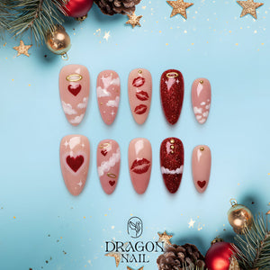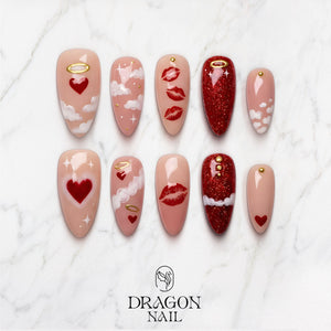 Angel Kiss Valentine Nails, Pink Red Heart Cloud Press-On Set, Romantic Nail Art, Limited Edition