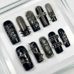 press on nails, gothic punk nails, chrome chain nails, spike accent nails, black statement nails, edgy manicure design, industrial style nails, bold fashion nails, alternative aesthetic nails, reusable press on nails
