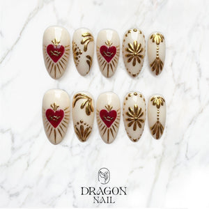 Deep red heart accents add a romantic centrepiece to the design, framed by radiant gold rays that give the nails a sacred, vintage-luxe appearance. The combination of pearl-white lacquer, solid gold elements, and rich red highlights creates an unforgettable high-fashion finish.
