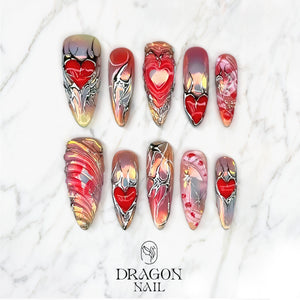 This striking Valentine-inspired set features molten-metal chrome detailing fused with bold red 3D hearts, creating a dramatic and futuristic look. The nails blend fiery red, smoky pink, and golden iridescence, giving each piece a fluid, glass-like finish reminiscent of melted metal art.