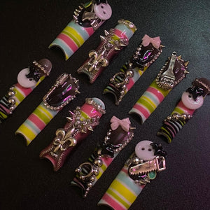This nail set bursts with vibrant color and playful decorative elements inspired by maximalist kawaii aesthetics. Bright rainbow tones create a lively base palette, while a mix of colorful shapes, cute motifs, and layered embellishments brings an energetic party-like atmosphere to the design. Sculpted 3D accents add dimension and texture, making each nail feel like a miniature collage of fun and creativity. Glossy finishes enhance the bold colors and reflective surfaces, giving the manicure a bright, candy-like shine. The long square silhouette provides a bold canvas that allows the colorful decorations and playful details to stand out clearly. The overall look feels cheerful, expressive, and unapologetically bold, perfect for anyone who loves vibrant statement nails with a playful and whimsical personality.