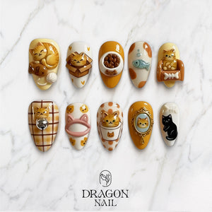 Inspired by cozy cat cafés and sweet bakery moments, this nail set features adorable kitten characters enjoying treats, bowls of snacks, fish icons, frames, and plaid patterns. Warm caramel, cream, and honey tones pair with glossy finishes and sculpted 3D charms to create a comforting, storybook feel.