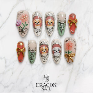 Inspired by classic portrait frames and gentle storybook charm, this nail set features hand-painted puppy portraits framed with ornate silver detailing, soft florals, and sculpted bows. Muted blush, cream, sage, and dusty rose tones create a refined, vintage aesthetic with a touch of sweetness.