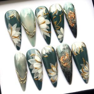 This stiletto nail set features a rich deep green base enhanced with refined floral artistry inspired by classic ornamental beauty. The design emphasizes graceful curves, layered petal details, and a high-gloss finish that elevates the overall look into a bold yet sophisticated statement. Subtle contrasts between dark tones and delicate accents create depth and visual movement, while the elongated stiletto shape adds drama and confidence. The mood feels luxurious, poised, and slightly mysterious, making the set ideal for evening wear, formal occasions, or anyone drawn to elegant, statement-making nail art with a timeless floral influence.