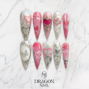 This romantic Valentine set blends soft pink tones with shimmering chrome silver, creating a dreamy, love-themed aesthetic. Glossy hearts, butterfly silhouettes, and metal branch details add depth and elegance, making every nail feel like a handcrafted jewel.