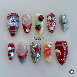 Peel off the top film and align the press-on nail with your cuticle, pressing down firmly from base to tip.