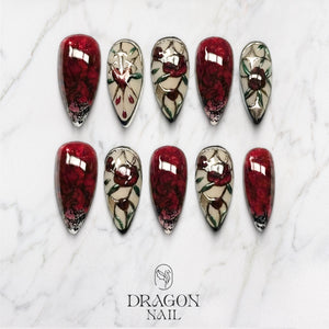 Inspired by dark romantic florals and stained-glass aesthetics, this nail set features deep crimson tones, sculpted roses, black lace accents, and translucent glass-like panels. The contrast between rich red petals and muted neutral backgrounds creates a dramatic, elegant gothic look.