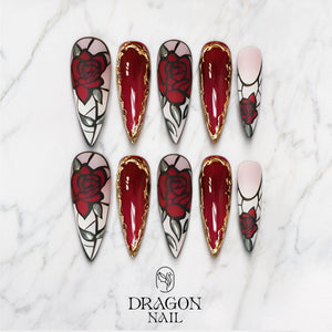 Gothic Rose Valentine Nails, Blood Red Gold Frame Press-On Nail Set