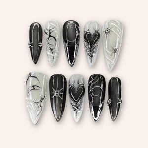 This press-on nail set embodies a bold gothic aesthetic through striking silver chrome details layered over a deep black base. Featuring sharp flame motifs intertwined with dark heart elements, the design delivers a powerful contrast between romance and rebellion. The reflective metallic finish adds depth and drama, while the sculpted shapes create a fierce, high-fashion edge. Perfect for alternative styling, night events, or statement looks, this handmade nail art channels confidence, intensity, and dark elegance in every detail.
