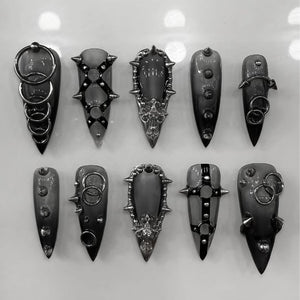 This nail set features a bold gothic-inspired design defined by dramatic black tones and striking metallic details. A deep glossy black base creates a dark and powerful foundation that highlights the edgy decorative elements. Sculpted spike accents and metal ring details introduce a rebellious industrial aesthetic, while chain-like elements add movement and layered texture across the nails. The metallic highlights reflect light against the dark surface, creating a sharp contrast that enhances the dramatic look of the design. Glossy finishes intensify the depth of the black color and emphasize the sculptural details, giving the manicure a strong statement presence. The overall aesthetic blends gothic elegance with punk-inspired edge, resulting in a manicure that feels bold, dramatic, and unapologetically expressive.