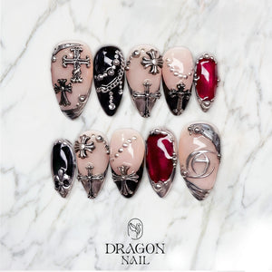 Gothic Cross Nails, Black Red Chrome Press-On Set With 3D Silver Charms, Limited Edition