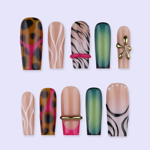 This nail set combines bold animal-inspired patterns with modern color gradients to create a striking and fashionable manicure. Smooth green ombre transitions flow across the nails, shifting from deeper emerald tones to softer translucent shades for a layered, dimensional effect. Leopard-inspired accents introduce a daring pattern that contrasts beautifully with the gradient base, while subtle gold details add a refined metallic highlight that elevates the overall design. The glossy finish enhances the richness of the colors and reflects light across the metallic accents, giving the manicure a polished and luxurious appearance. The long square shape provides a strong, contemporary silhouette that complements the bold patterns and vibrant tones, resulting in a stylish nail set that feels expressive, glamorous, and modern.