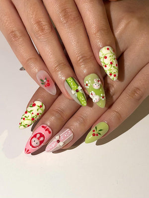 This handmade press-on nail set features a playful kawaii aesthetic inspired by the cheerful colors of spring and Easter. Soft pastel pink and green tones create a fresh and lively base that reflects the bright and joyful energy of the season.
