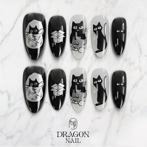 This minimalist nail set features sleek black-and-white cat illustrations, clean lines, playful poses, and simple graphic elements. The high-contrast monochrome palette delivers a modern, artsy look that feels calm, stylish, and effortlessly cool.