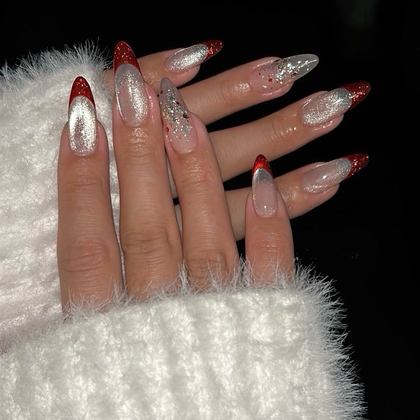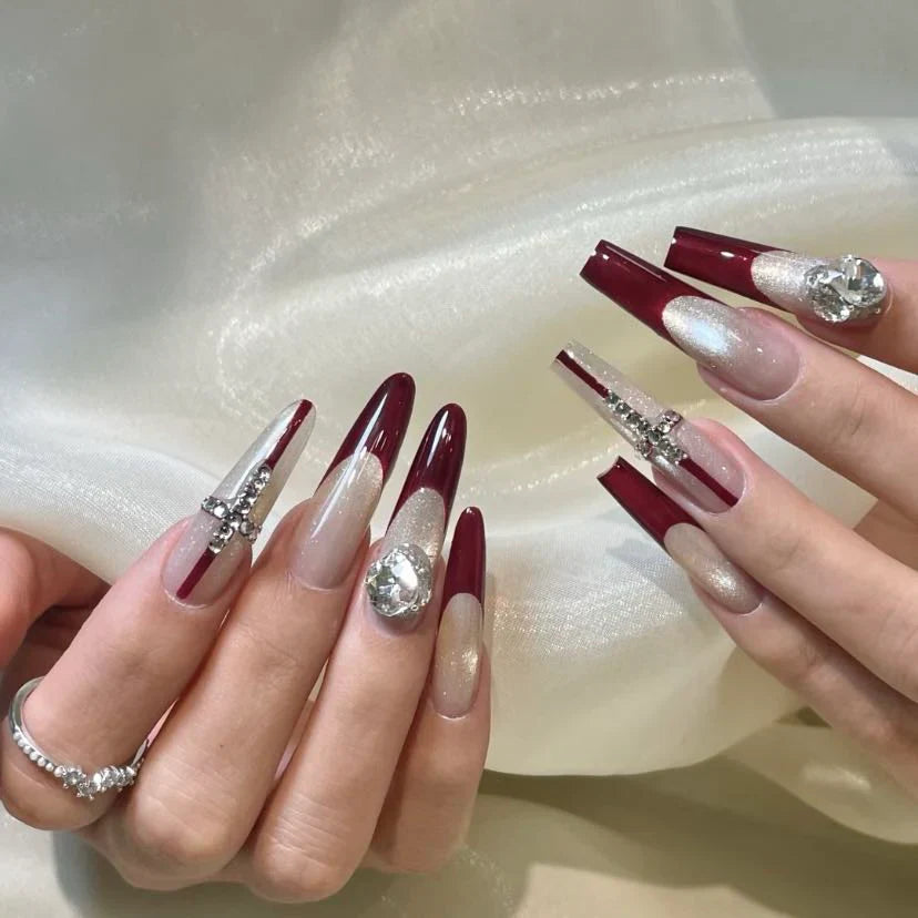 Peel off the top film and align the press-on nail with your cuticle, pressing down firmly from base to tip.