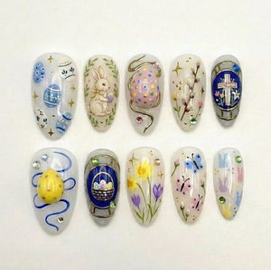 This handmade press-on nail set celebrates the cheerful spirit of Easter with soft pastel colors and charming seasonal details. The gentle palette creates a light and joyful look that reflects the warmth and freshness of springtime celebrations.
