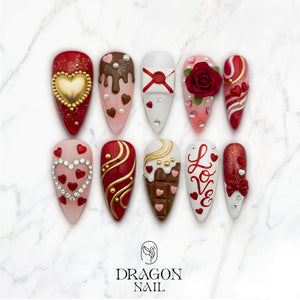 This Valentine’s Day nail set is a romantic, luxurious blend of hearts, gold accents, and delicious chocolate-inspired designs. Each nail features stunning 3D details — from gold-framed hearts, dripping chocolate effects, and sparkling gems to a sculpted rose, love-letter motif, and swirling red-and-white candy patterns.