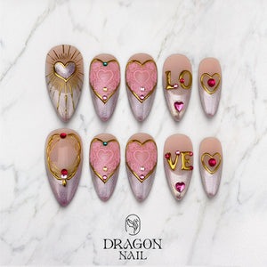 This romantic set features a luxurious blend of blush pink lace hearts, champagne shimmer bases, and radiant gold framing. Each nail showcases elegant detailing — from glowing heart outlines to bold “LOVE” lettering — delivering a soft yet regal Valentine aesthetic.