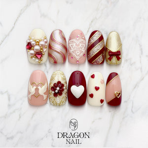 This luxurious Valentine nail set features deep red, blush pink, and shimmering gold tones — paired with lace hearts, 3D doves, pearls, glitter stripes, and sculpted charms. Perfect for romantic dates, gifts, photoshoots, or anyone who loves a classy, feminine Valentine aesthetic.