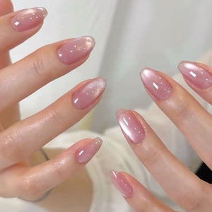 This nail set features a soft blush pink base enhanced with a subtle pearlescent glow that reflects light beautifully for a clean and elegant finish. The almond shape elongates the fingers, while the sheer, milky tones create a natural yet polished look. Fine shimmer particles are seamlessly blended into the glossy surface, adding depth and a gentle luminous effect without overpowering the design. The overall mood is delicate, romantic, and effortlessly refined, making these nails ideal for everyday wear, special occasions, or a minimal luxury aesthetic inspired by soft light and graceful femininity.