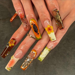 This vibrant nail set showcases a lively tropical aesthetic inspired by sun-ripened fruit and blooming island florals. Warm papaya-orange tones blend seamlessly with soft yellow and coral hues, creating a juicy, sunlit color palette that feels fresh and energetic. Hand-painted floral details and fruit-inspired elements add dimension and playful artistry, while glossy finishes enhance the vivid colors and bring a polished look. The overall mood is bright, carefree, and exotic, evoking summer vacations, tropical gardens, and warm ocean breezes. Perfect for making a bold seasonal statement, this design balances cheerful color with detailed craftsmanship for an eye-catching manicure.