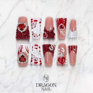 This Valentine-inspired luxury set is bold, glamorous, and made to stand out. Featuring deep ruby red crystals, oversized heart gems, angel cherubs, pearls, and diamond-like embellishments, each nail is crafted to create a dramatic romantic statement.