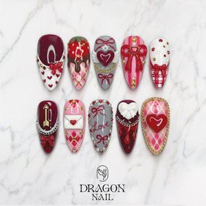 Designed to stand out, this set mixes glossy finishes with sculpted charms and delicate patterns like plaid, drips, and framed hearts. Each nail feels like a miniature Valentine keepsake—perfect for those who love statement nails with a romantic edge.