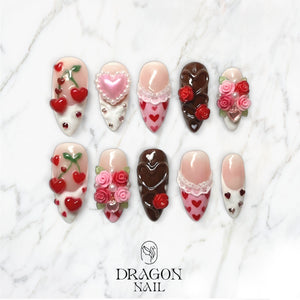 Perfect for Valentine's Day, anniversaries, date nights, romantic photoshoots, or anyone who loves cute, girly, candy-inspired nail art. This set feels like a box of chocolates and roses — wrapped into a manicure.