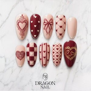 This set brings classic Valentine charm with a soft nude base paired with deep romantic red details. Each nail features hand-drawn heart motifs, delicate ribbons, vintage-inspired lace hearts, checker patterns, and dotted accents. The result is a sweet yet elegant look that feels timeless and feminine.