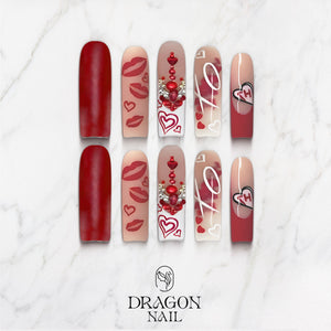 This Valentine-themed set blends soft nude tones with deep romantic red, capturing the sweetness of handwritten love notes and candy-box charm. Charming elements like tiny hearts, kiss prints, and glossy strawberries bring a playful, affectionate flair to every nail.
